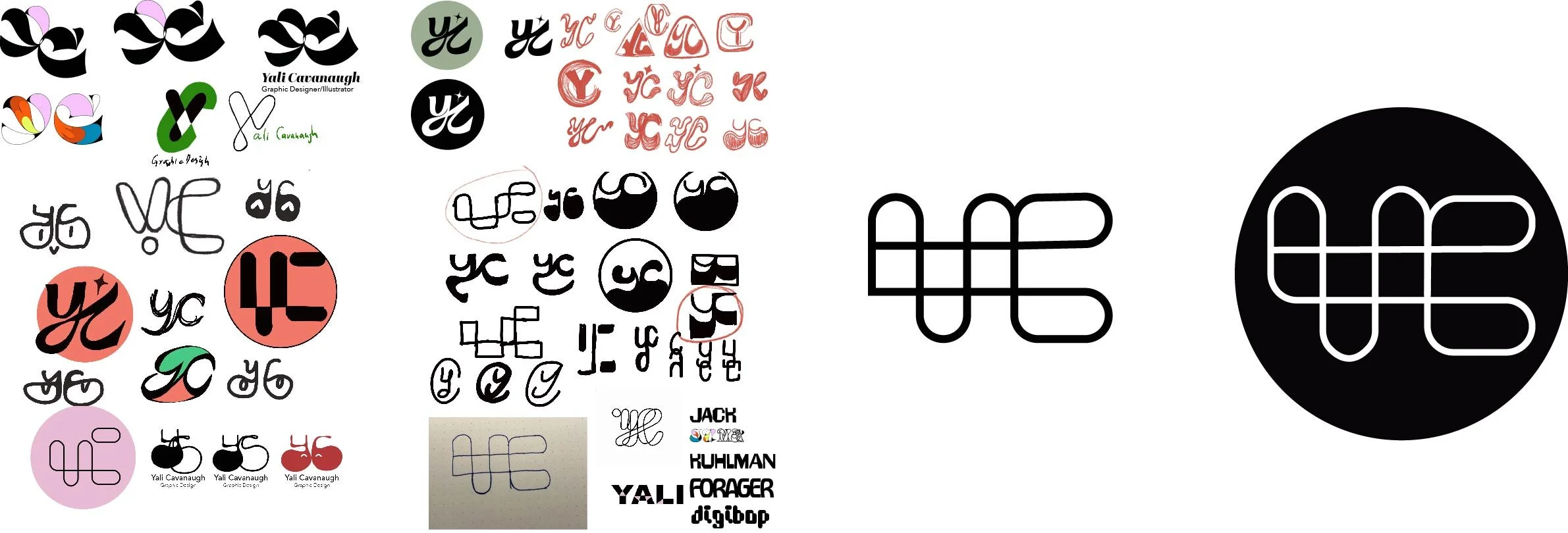The final monogram is a continuous-line "YC" built on a geometric grid. This "circuit" style symbolizes the seamless integration of strategy and creativity. By refining hand-drawn sketches into a precise mathematical system, I created a mark that maintains its integrity across all platforms, from digital favicon to physical brand applications.